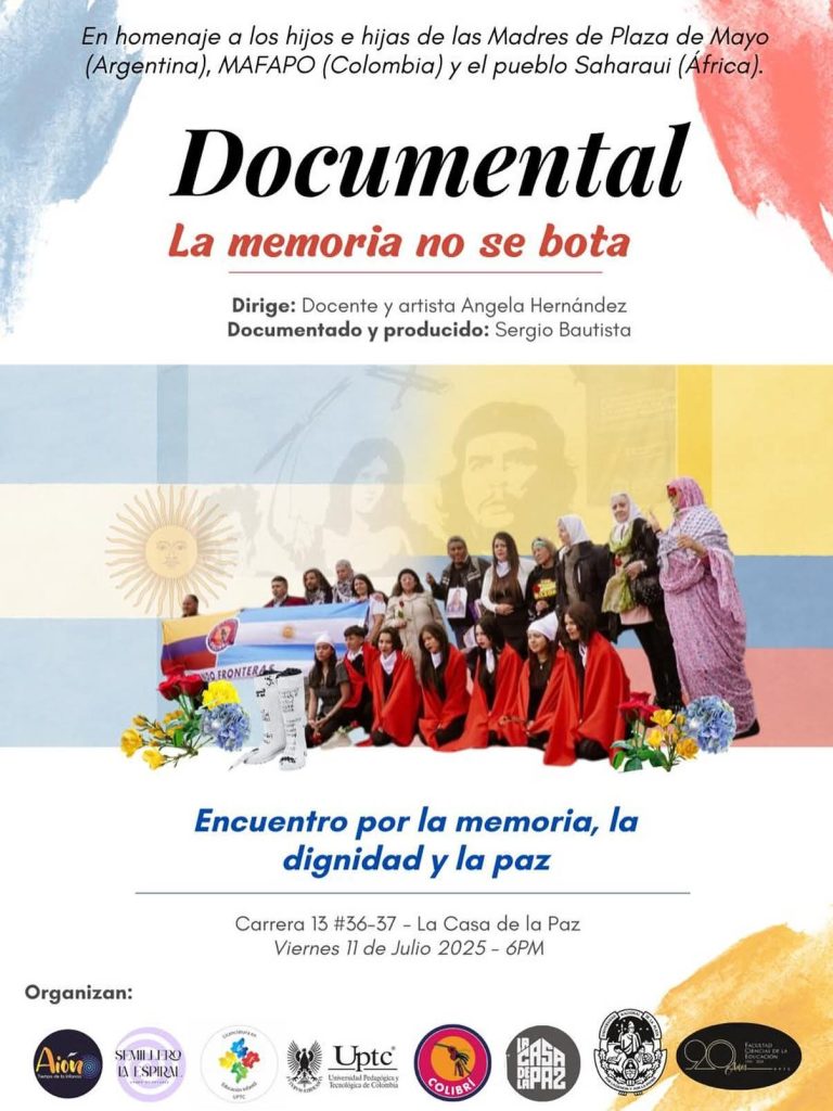Este viernes 11 de julio, el documental “La memoria no se bota” será estrenado en Bogotá Colombia, en La Casa de La Paz, carrera 13 # 36-37, a las 18 hs, con entrada libre y gratuita.